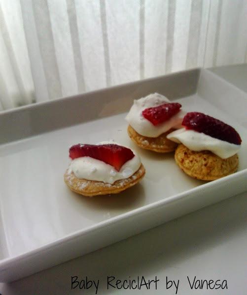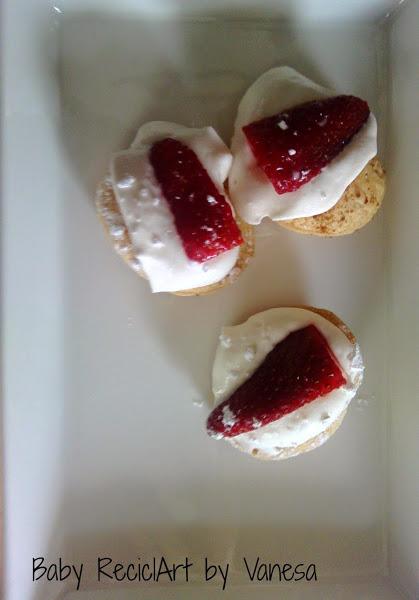 Colocamos encima una frambuesa o un cuarto de fresa (o una mora) y espolvoreamos con azúcar glasé.