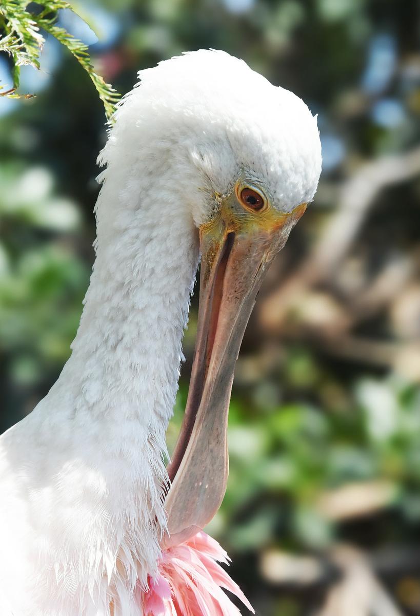 La espátula rosada tiene un pico que acaba con forma plana.Lo usa como una pala para bajo el agua, extraer pececillos.