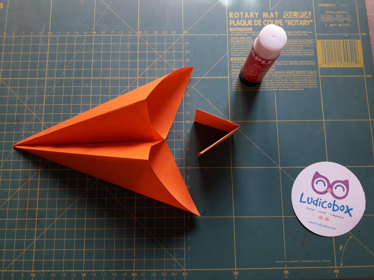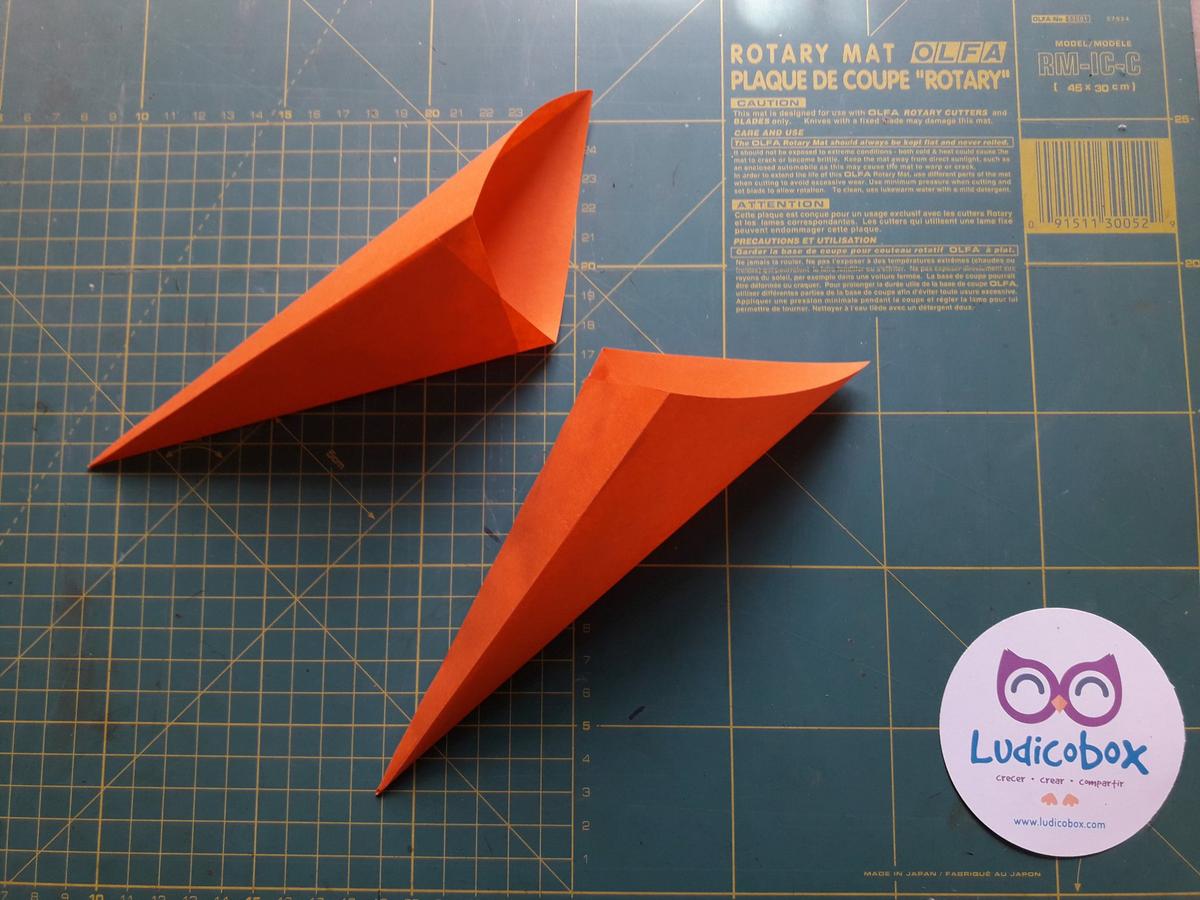 Solapamos y pegamos los 2 triángulos. Nos queda como un cono triangular.