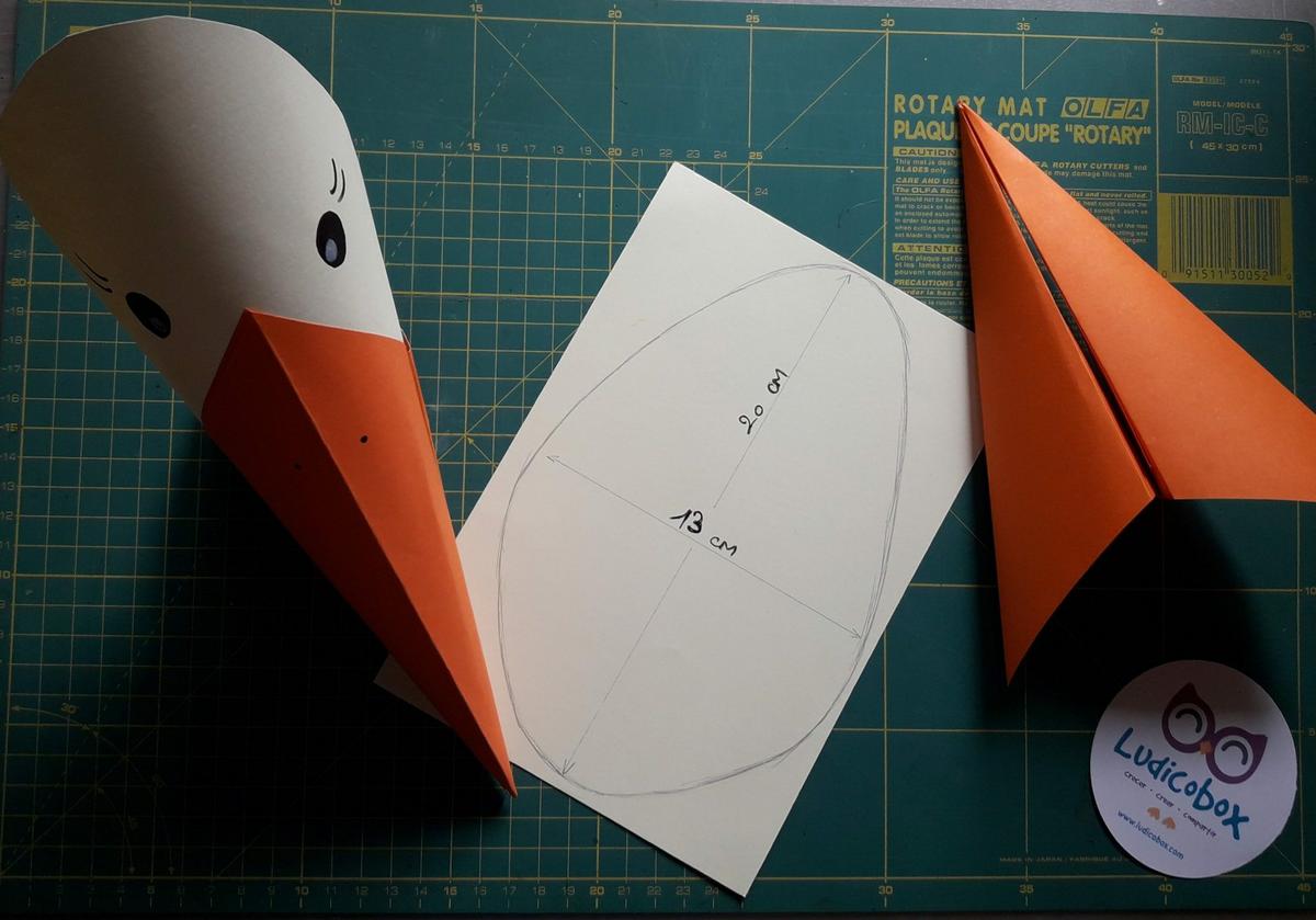 Ahora toca utilizar la cartulina blanca. Dibujamos y recortamos una forma como un huevo de unos 20 cm de alto y 13 cm de ancho. La parte más estrecha del huevo se desliza dentro de pico y se pega al mismo.