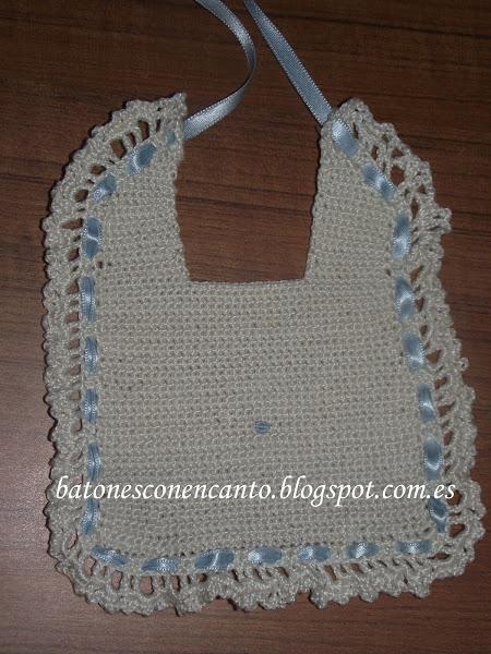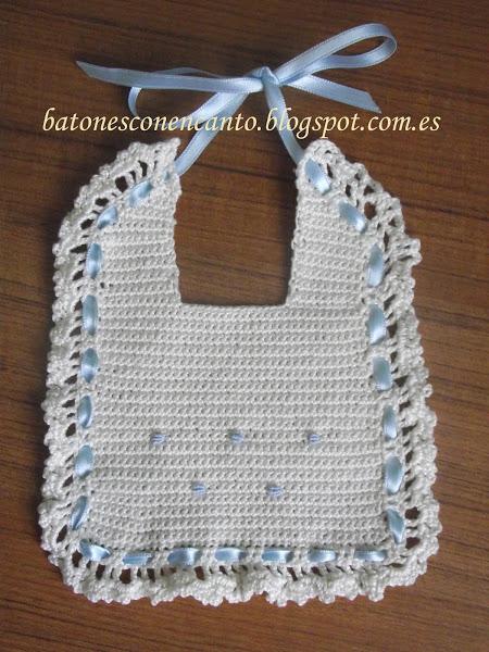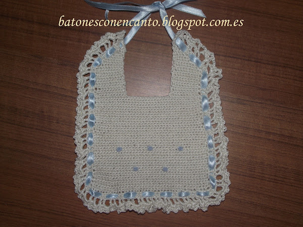 Buenas tardes... Comenzamos la semana con un bonito babero que terminé este fin de semana. Hacía mucho que queria hacer un babero así, con dos agujas, y por fin os lo puedo enseñar. Está hecho con hilo de primera calidad ,como es DMC, en color beige y como veis, con solo cambiarle el lacito, tenemos un babero nuevo en cada momento y a juego con lo que le pongamos! A mi siempre me ha gustado mucho ...