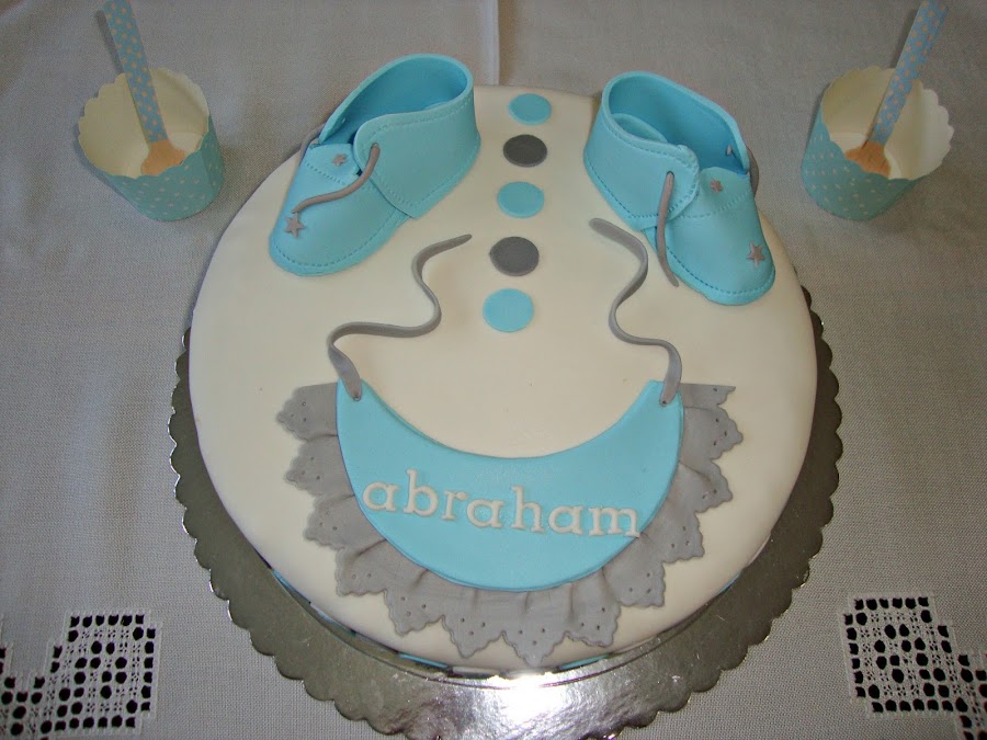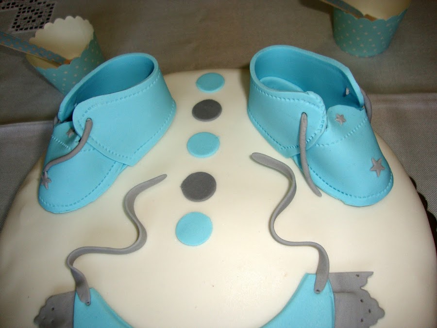 Los amigos querían dar una sorpresa a unos futuros papis y decidieron dar una fiesta con unos dulces personalizados para celebrar la llegada del bebé Alejandro. Una sorpresa deliciosa. La tarta era un bizcocho Red Velvet relleno de dulce de leche, con cobertura de ganache de chocolate. Toda la decoración estaba realizada en fondant en tonos azules y blancos. La tarta tenía como motivos infant ...