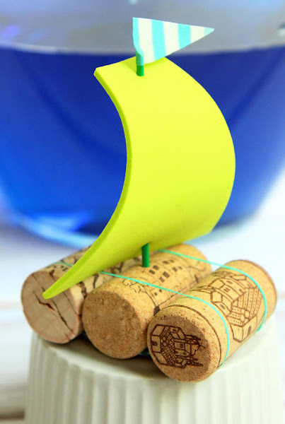 Su ensamblaje es bien sencillo. Primero haremos la base uniendo los corchos con gomillas, más tarde colocaremos la vela hecha de goma eva ayudándonos de un palillo de dientes que clavaremos en la parte inferior y remataremos el barco con un adorno.