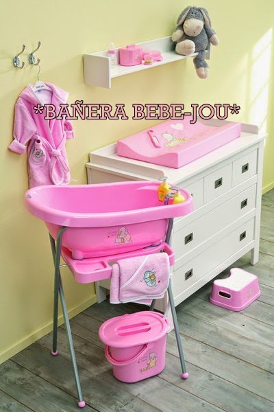 Y por ultimo la bañera, de la marca bébé-jou. Opte por un diseño diferente y original. Con termómetro y dos dosificadores incorporados y de gran espacio, ya que hace la función para cuando es muy pequeñita y luego para cuando se hacen más grandecitos, se le sacará el máximo partido. Luego el soporte trae una bandeja para colocar la esponja y la toalla y además se pliega facilmente para poderla guardar en cualquier rincón. Color rosa.
