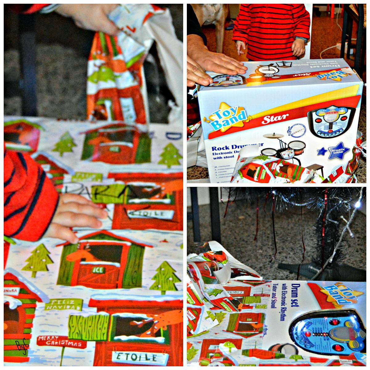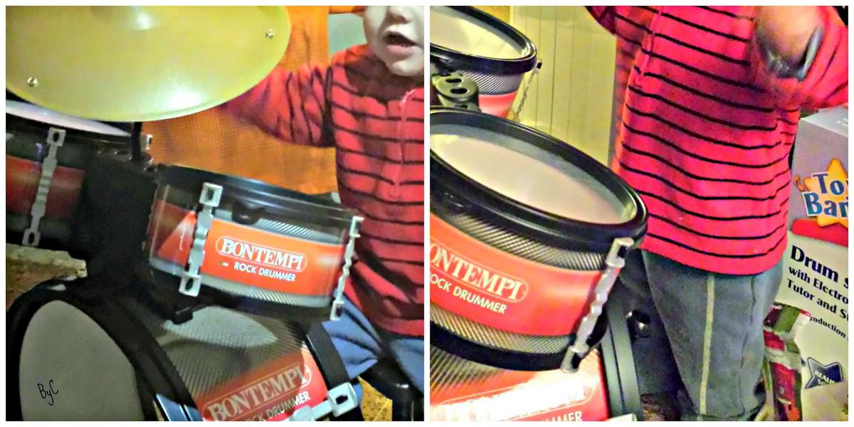 La misma tarde de Nochebuena Papidire no pudo esperar más y decidimos dar el regalo a Vikingo, me lo llevé a la habitación con Perrogato y a la vuelta el enano se quedó sorprendidísimo al ver el gran paquete que había bajo el árbol. La que me sorprendí fui yo, al ver como Vikingo casi no dejaba montar la batería a su padre y le quitaba los bombos y el platillo. La batería estaba recomendada para mayores de 3 años, era algo que también me preocupaba pero tras comprobar que no había peligro nuestro pequeño músico comenzó a disfrutarla. Vikingo ha recibido más regalos por Papá Noel y Reyes, pero desde luego este se lleva la palma. Nunca le he visto más feliz con nada, se pasa el día baquetas en mano frente a su batería, lanzando las baquetas por el aire cuando ha terminado la función, repitiendo sonidos una y otra vez, intercalando tiempos, siguiendo ritmos que le marca el padre y sobretodo tarareando en su lengua extraña mientras toca su preciado instrumento. El jodío niño toca mejor que yo, que soy un pato para la música. Decididamente Vikingo adora la música y al final me alegro de haber cedido, eso sí, de momento hay horarios restringidos donde el chisme se queda mudo y se respeta el sueño de los vecinos, bueno y el nuestro que al final me va a tocar insonorizar la casa. Siempre quedan los palillos chinos y el lavavajillas para esos momentos. ¿Qué les habéis regalado a los peques?¿Os ha tocado ceder ante algún regalo?