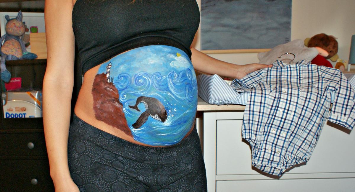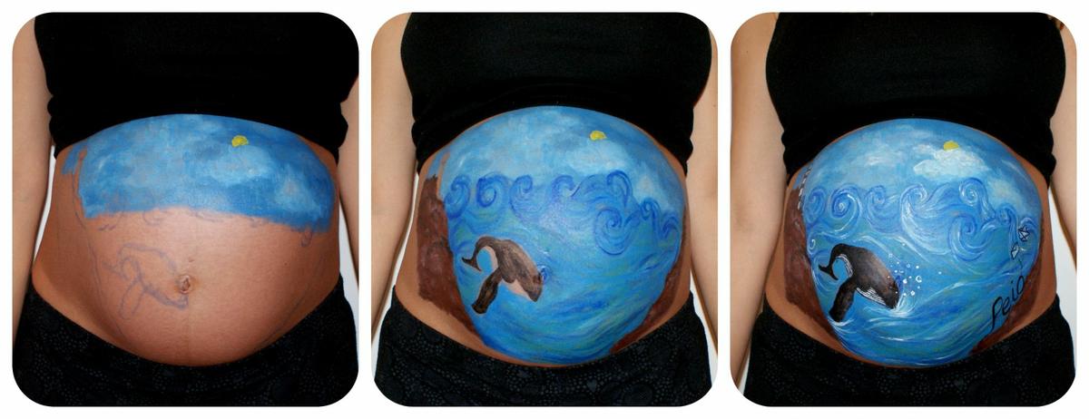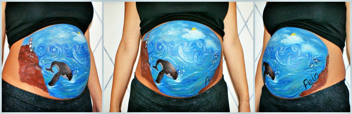 Belly Paint Rakel, es una pintura artística muy elaborada realizada en el embarazo. La pintura es una paisaje marinero con mucha fuerza. Destaca y predomina el color azul con mucha fuerza. En el cielo hemos usado un azul con blanco y en el mar lo hemos combinado con color verde y morado.