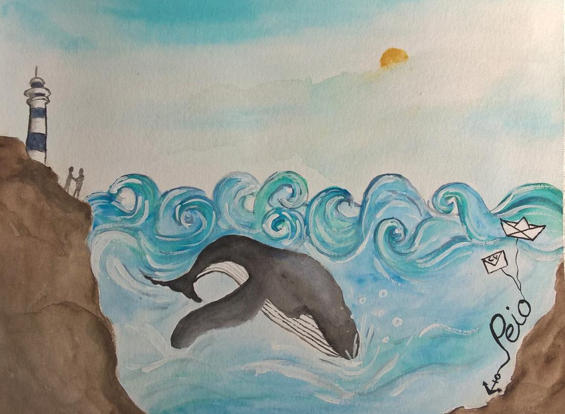 La parte central está ocupada por una ballena sumergiéndose en el agua, y un montón de olas de fantasía.