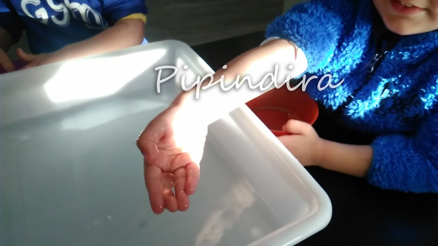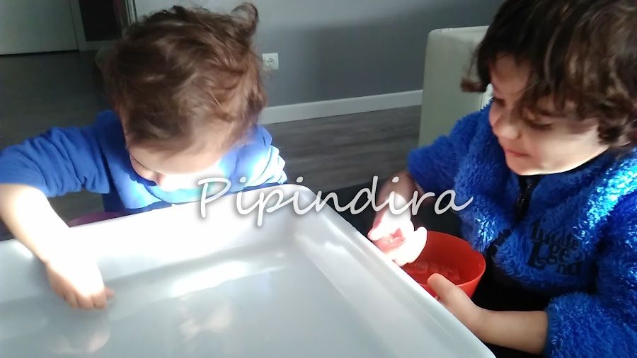 Bueno pues después de comer les puse la bandeja llena de agua y con las bolas dentro. No se veían, ellos pensaba que sólo había agua pero les dije que metieran la mano para tocar el agua y cuando lo hicieron me miraron sorprendidos y extrañados. Volvieron a tocar y sacaron las bolas para enseñármelas.