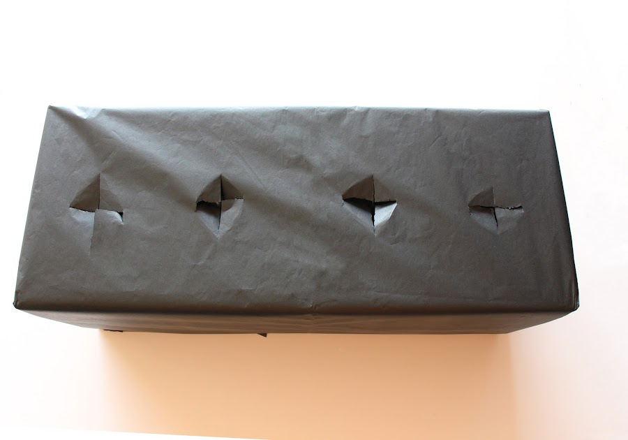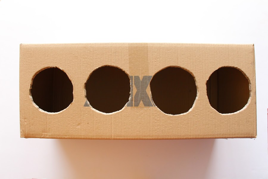 Cojemos una caja rectangular, dibujamos 4 círculos, ésto dependerá de la medida de la caja, pero pensad que se tienen que hacer círculos suficientemente grandes para introducir la mano y averiguar què hay dentro