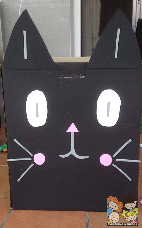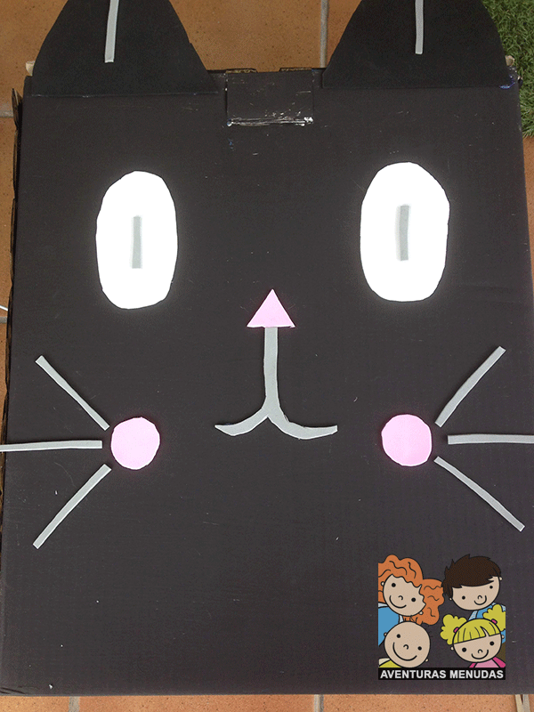Empezamos a montar el diseño y lo que nos queda es pegar con pistola de pegamento caliente todas las partes que forman la cara del gatito. Todo ello después de que se hubiera secado por completo la pintura de la caja.