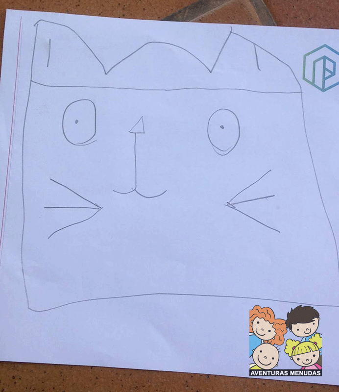 A continuación, el diseño de la misma. En este caso un animal y el favorito de la cumpleañera son los gatos… pues nada. Mi peque de 4 años realiza el diseño a partir del cual nos basaremos para convertir la caja. ¿A que es muy divertido?