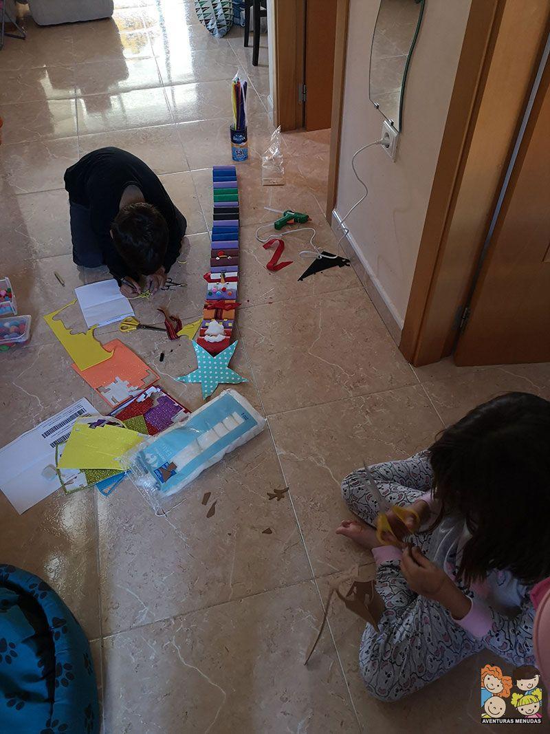 Los artistas han sido los peques, la verdad es que entre todos hemos decidido los personajes a poner, cada uno hacía uno, recortaba, dibujaba, decoraba y yo iba pegando las diferentes partes con la pistola de pegamento caliente.