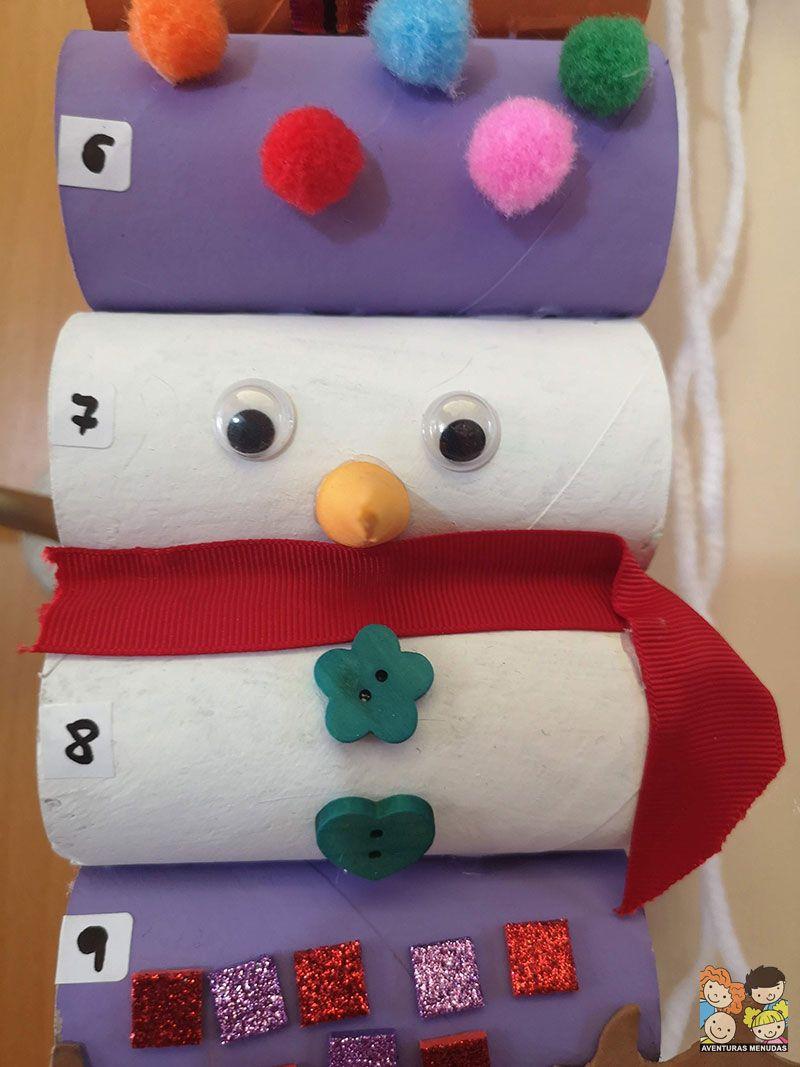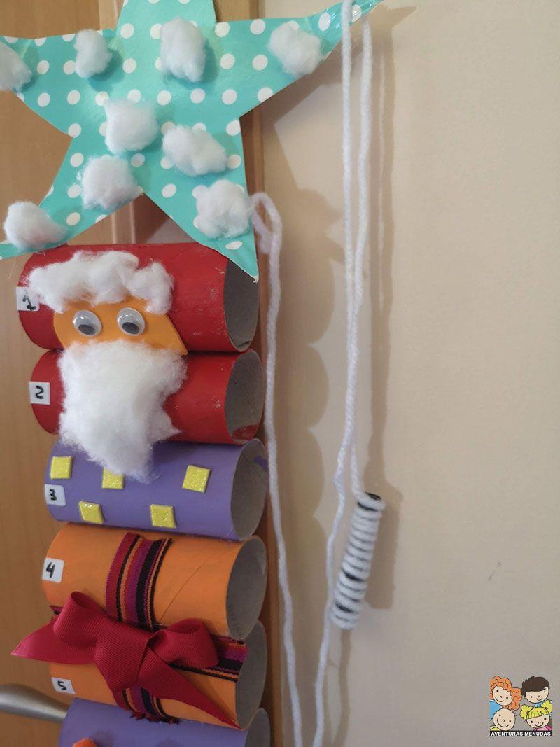 Para marcar el día, podéis usar una pinza que vais cambiando de rollo cada día de adviento. Nosotros usamos un poco de lana y un tubito de plástico de las bolsitas que venden para recoger las necesidades de los perros. Le pegamos la lana alrededor y la atamos al cordel que hemos usado para colgarlo, también hecho de lana.