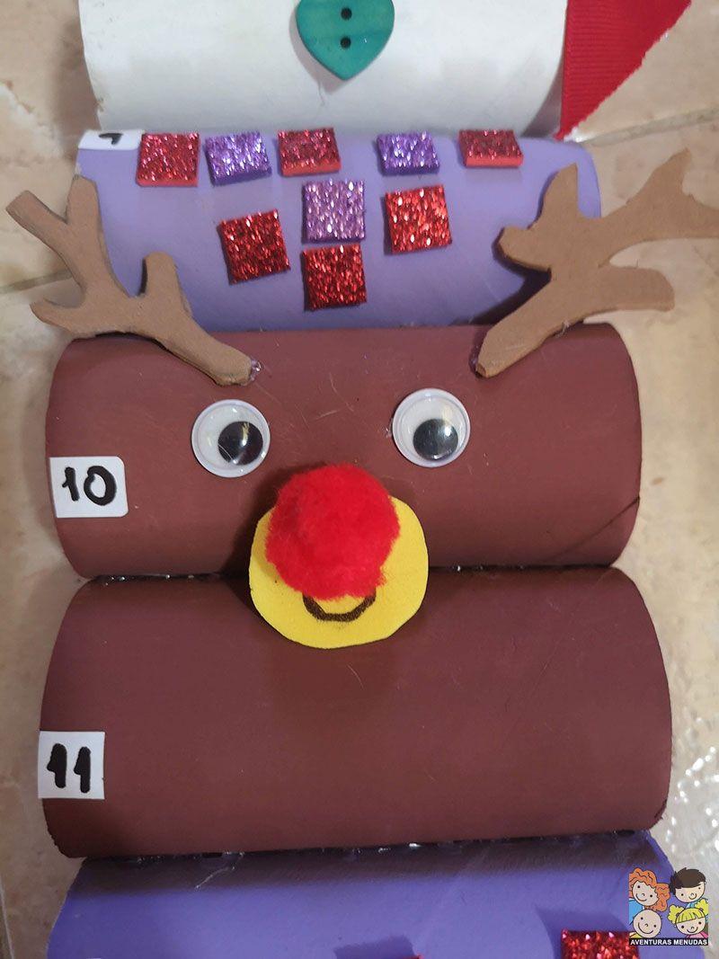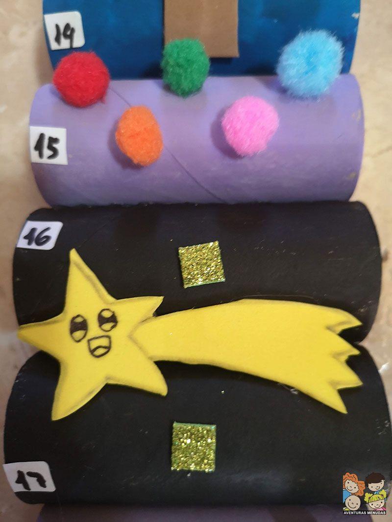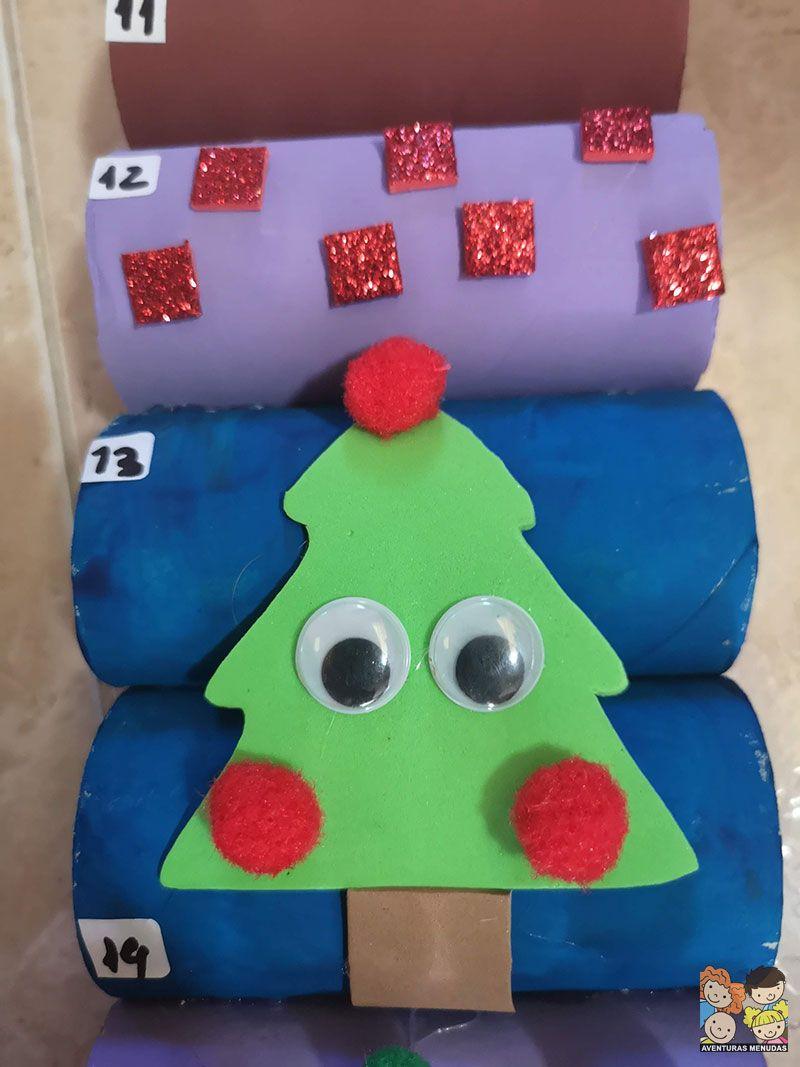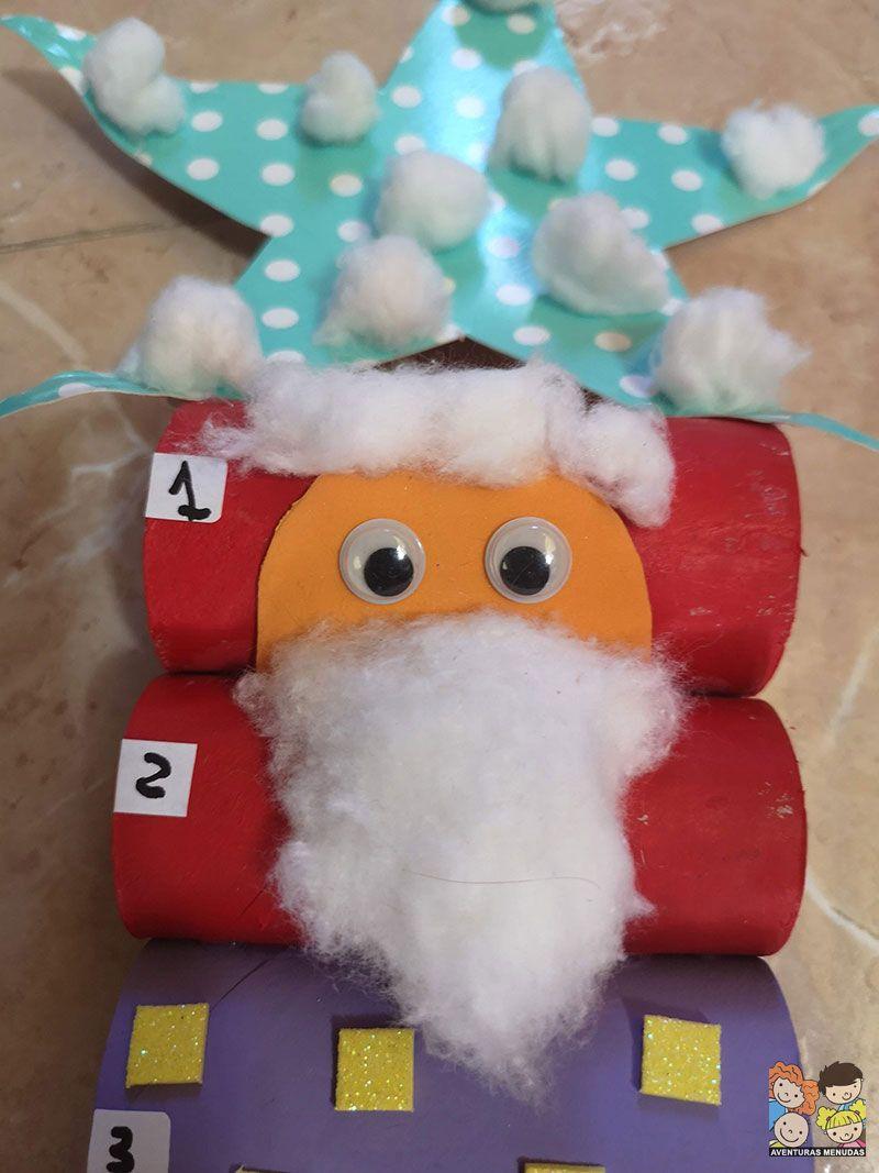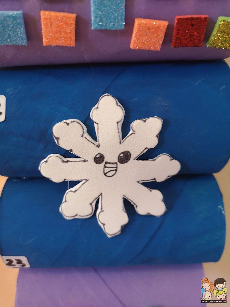 Se pegan uno junto a otro hasta formar todo el calendario. En la parte superior podéis dejarla sin nada o poner algún elemento de Navidad. Nosotros recortamos un plato de cartón con forma de estrella y después le pegamos bolitas de algodón.