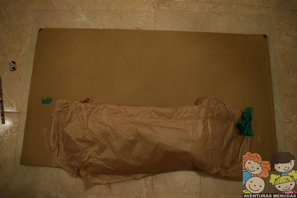 Nosotros partimos de un cartón con una cueva que hicimos para el proyecto del cole de mi peque sobre la prehistoria (esto os lo contaré en breve en otro post). Con lo que teníamos el cartón y teníamos una especie de bolsa que era la cueva que hicimos en su momento.