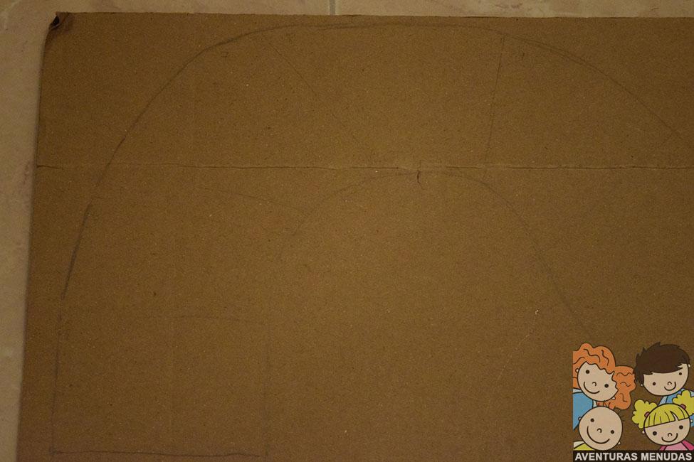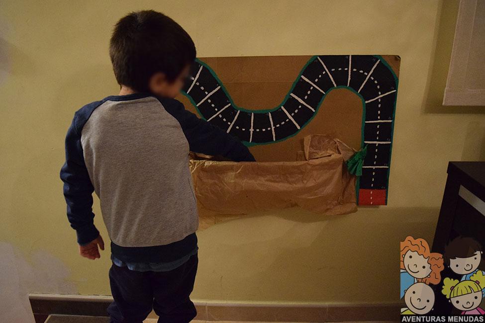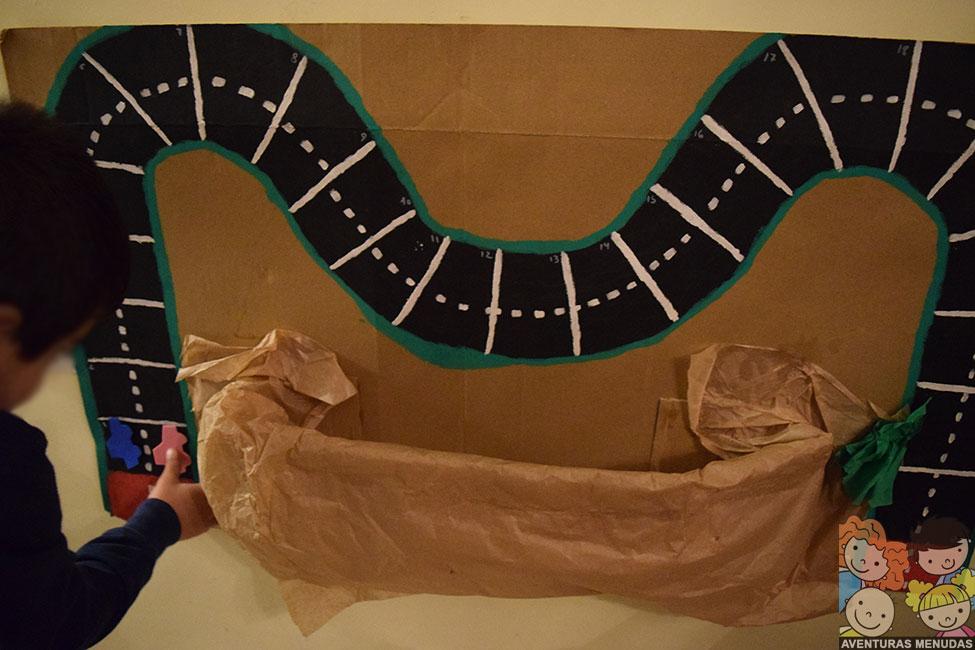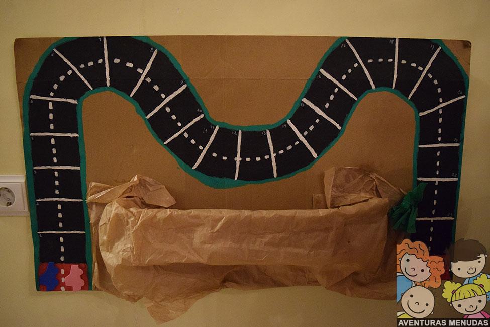 Una vez preparado el cartón y recipiente, lo primero es dibujar la carretera. Nosotros dibujamos el circuito con un lápiz primero, para poder determinar si cabían todas las casillas que se necesitaban (25 + la salida) y ver si la configuración valía.