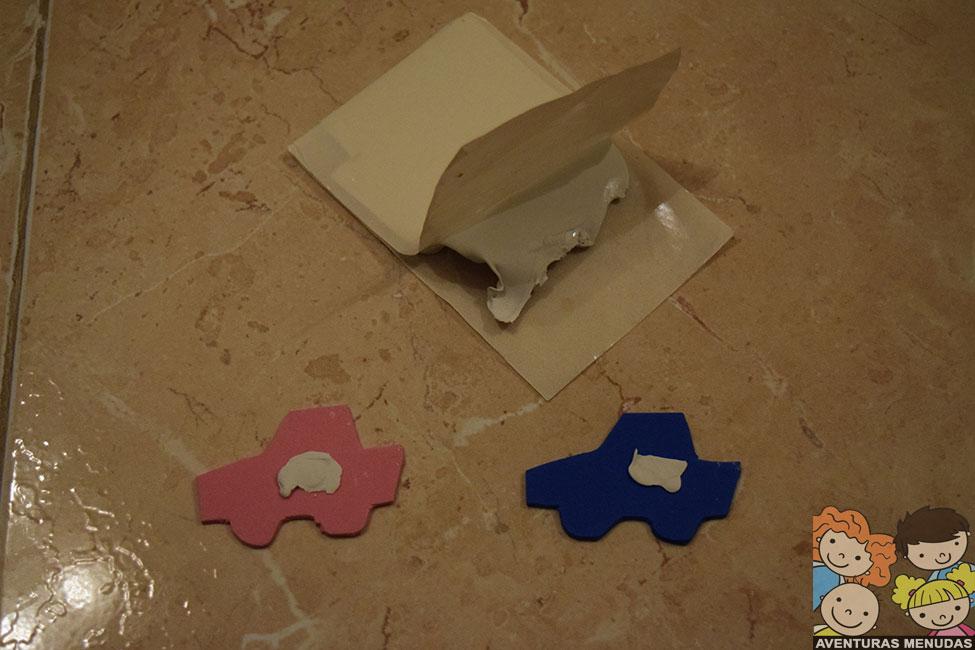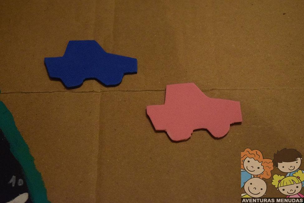 Lo siguiente fue medir las casillas y adecuar el tamaño de los coches a ellas para que quepan sin problemas. Con ese tamaño dibujamos dos coches iguales en dos trozos de goma eva. En este caso, cada uno eligió el color de su coche, dibujamos en contorno en la goma eva y luego lo recortamos.