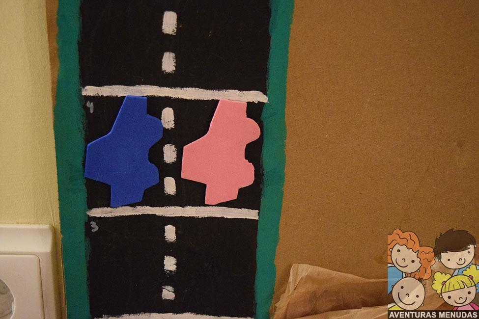 Para los coches, pusimos un poquito de white tack (aunque vale también la cinta de doble cara), para que puedan ir poniendo y quitando el coche de cada casilla y no se levante la pintura.