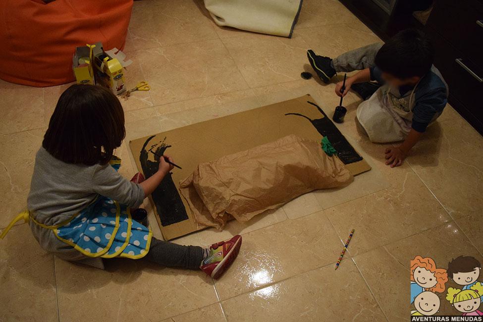 Preparados con sus delantales se pusieron a ello enseguida. Súper concentrado!!!! Mira que se lo pasaron bien pintando de negro e intentando no salirse (aunque yo les fui delimitando la carretera con un pincel más pequeño, ya que el lápiz casi no se veía).