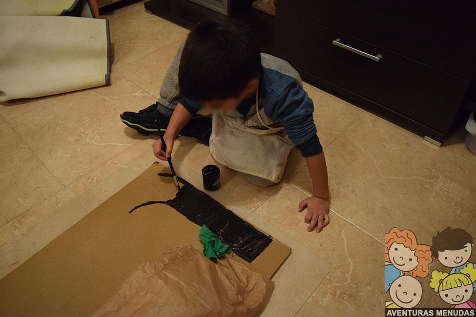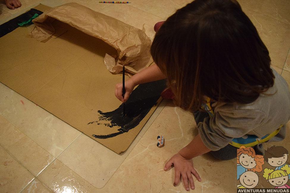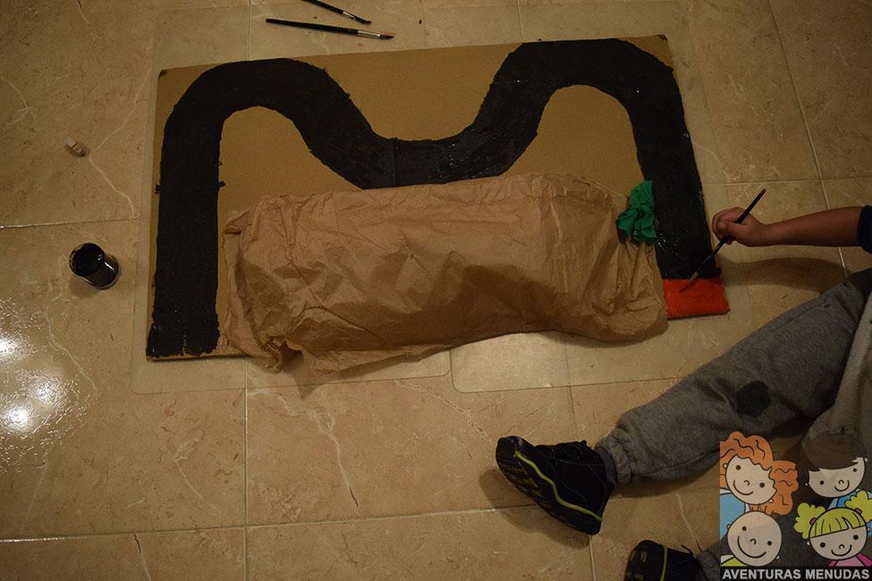 Una vez decidido el circuito, lo primero es pintarlo entero de negro. Así que pinceles para todos y tempera de color negro y ¡manos a la obra!.