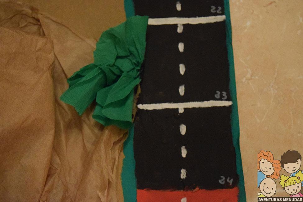 Pintamos alrededor del contorno de toda la pista un trozo en verde para que quedara un poco más decorada. También pusimos en cada casilla un número del 1 al 24, siendo la primera casilla la salida y la última el día 25 Navidad. Esto lo pintamos con un rotulador blanco que tenemos multisuperficie, pero podéis probar con temperas y un palillo, con números de pegatina que venden en los bazares o un poco más grandes con pincel.