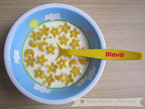 Leche con azúcar y cereales bien remojados, porque la peque coge únicamente las estrellas y las lunas, dejando toda la leche en el cuenco de Peppa pig, así que la única manera que tenemos de que tome algo de la misma es remojar bien los cereales en ella !! Eso si, pasar lo pasamos bomba, porque la nena se pasa todo el desayuno cantándole a las lunas, a las estrellas, al sol y a las nubes del cuenco, : )