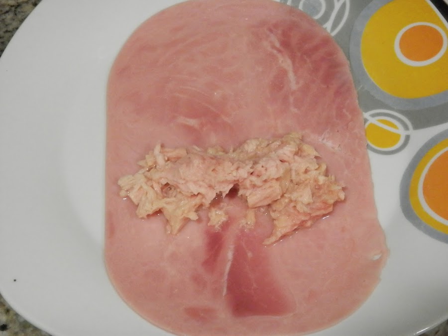 En un plato, pondremos una de las lonchas de jamón york y añadiremos dos cucharaditas de atún.