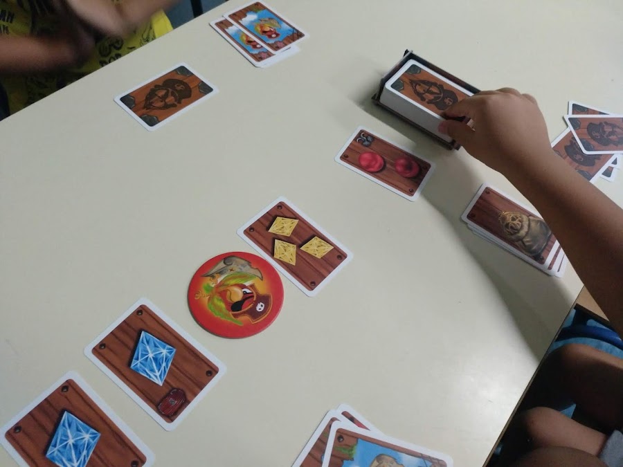 Primera carta del tesoro: el jugador saca la carta superior del tesoro la pone en el centro de la mesa boca arriba alrededor del disco Parche, el loro” y al lado de las otras cartas que se hayan podido sacar en turnos anteriores.