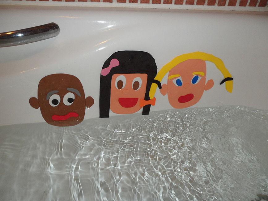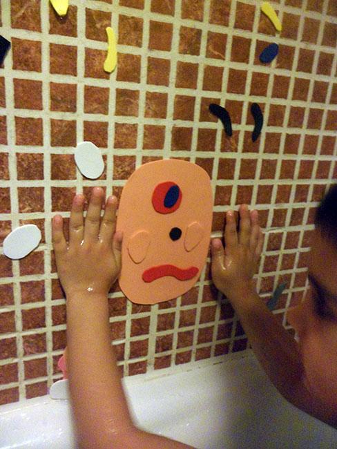 Además de un juego super divertido para la bañera, podéis trabajar las partes de la cara, los colores, las emociones, los estilos y vamos todo lo que se os ocurra. Y por supuesto muy muy lúdico y entretenido, donde también dan rienda suelta a su imaginación. Todo un éxito, ¿no creéis? Creo que lo siguiente, será crear imágenes para que copien los estilos y las emociones, con fotos plastificadas o algo así. Seguro que les encanta.