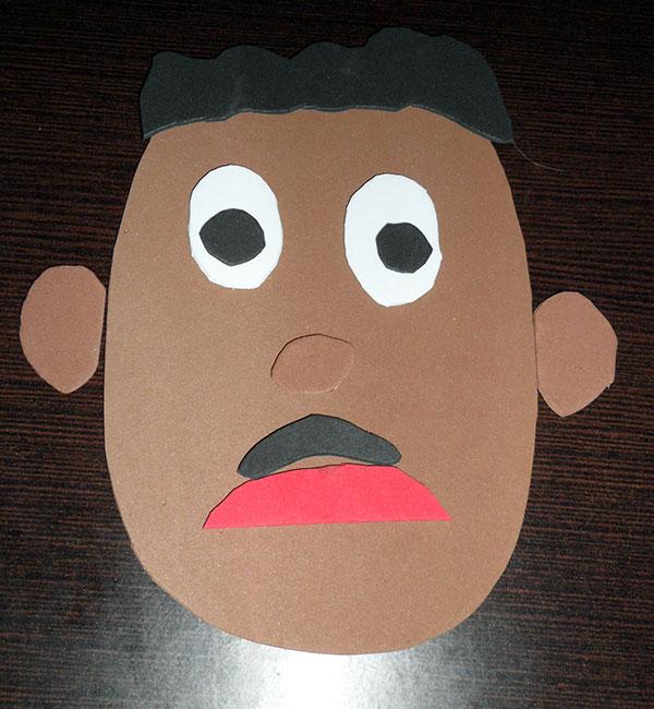 Comencé recortando los óvalos de las caras, dos color carne y otra color marrón para jugar un poco con las diferentes razas. Lo siguiente, recortar varios óvalos blancos como fondo de ojo, unos más redondos y otros como si fueran óvalos cortados por la mitad, para jugar más con las expresiones de enfado y tristeza.