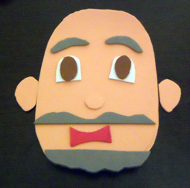 Para hacer la cosa más divertida, recorté también lazos, unas narices redondas rojas para hacer payasos, cejas de varios colores, barbas y bigotes. Vamos un arsenal de piezas de goma eva de todos los colores y tamaños. Me faltaron las gafas, que las incorporaré en breve.