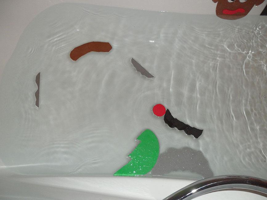 Lo primero que probé era si la goma eva que tenía en casa, comprada en un bazar, servía para pegarse bien en la bañera. No solo las piezas base, sino el poder pegar unas piezas de goma eva sobre otras y que se quedaran fijas. La verdad es que funcionan muy bien. Simplemente mojándolas y colocándolas tanto en la bañera como en la pared con azulejos, las figuras se quedan y no se caen. Así que ya lo tenía claro, podía usarla sin problemas.