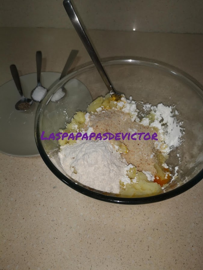 Añadir sal, pimienta molida, Maicena, harina y pan rallado