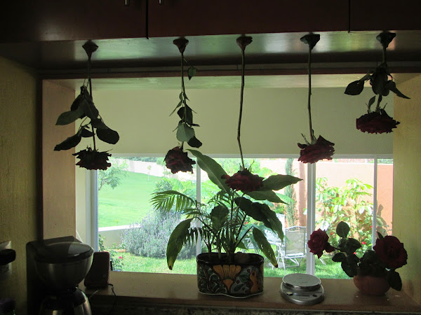 Este verano retoñaron de forma especial las plantas, algunos árboles que tenían tiempo sin crecer dieron hermosas ramas, los jardines se ven llenos de flores y un gran colorido. Los rosales del jardín nos han dado hermosas rosas, pienso cuando las veo que son regalo directo de la naturaleza para nosotros, tal vez es un "gracias por cuidarme", "sonríe", "carpe diem", "Dios nos ama", ¿Cuántas cosas nos dirán? Cuanta perfección, cuanta sutileza... Creo que el lenguaje silencioso es el más efectivo y reflexivo. Cuando las veo algo cansadas, tal vez por el sol y la lluvia, las corto y las pongo en agua unos días y después de algunos días las pongo "al revés" con una bola de plastilina en la alacena de la cocina para que se sequen y así que siga su sencillo y profundo lenguaje silencioso.