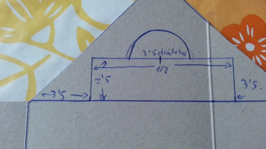 Marcamos desde los bordes hacia dentro 3,5cm y subimos 2,5cm.A la 1/2 hacemos una semicircunferencia de 3cm de diámetro.Esta es la abertura para sacar las servilletas.