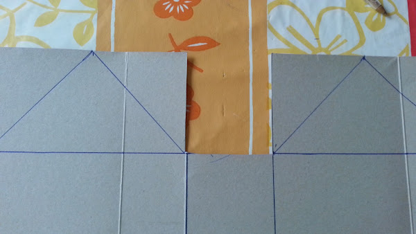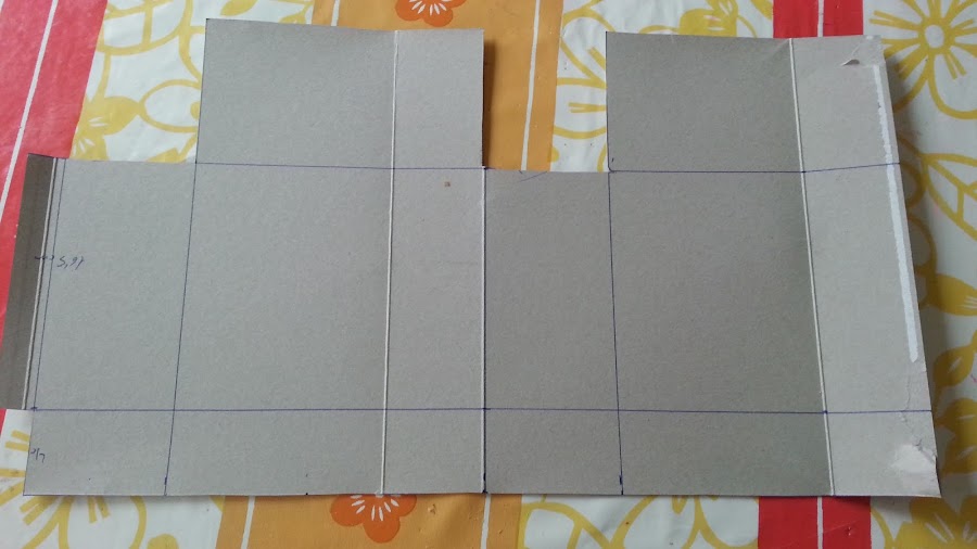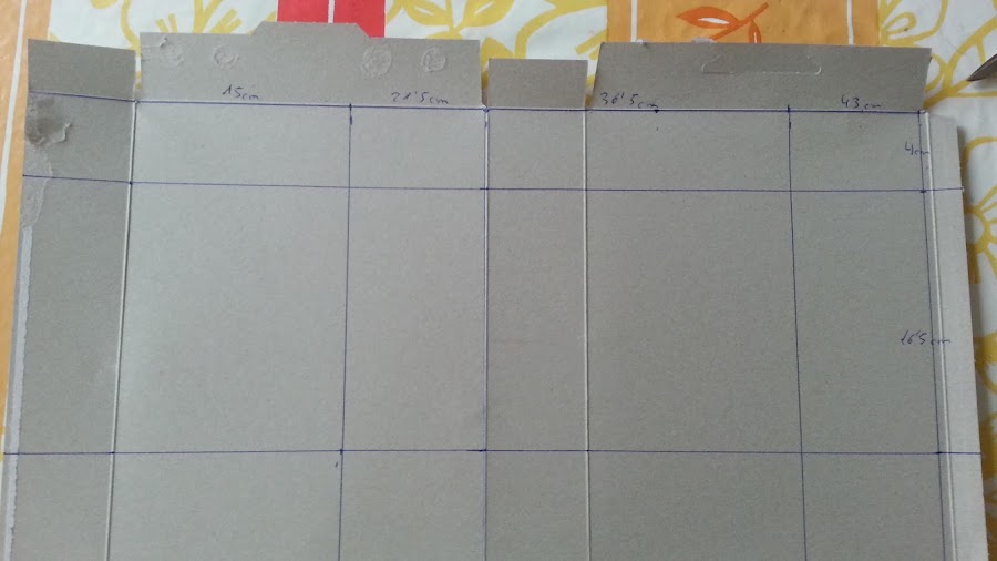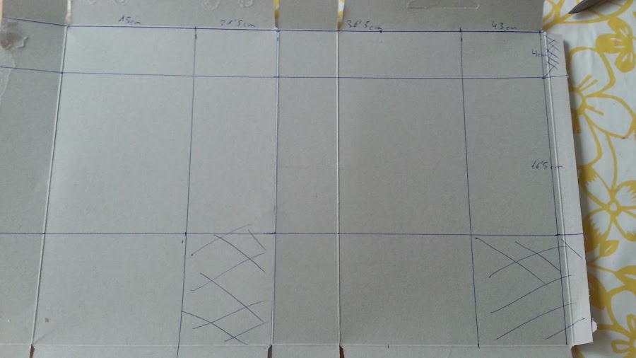Marcamos líneas en la parte de arriba a 15 cm,21,5 cm,36,5 cm y a 43 cm y las unimos.