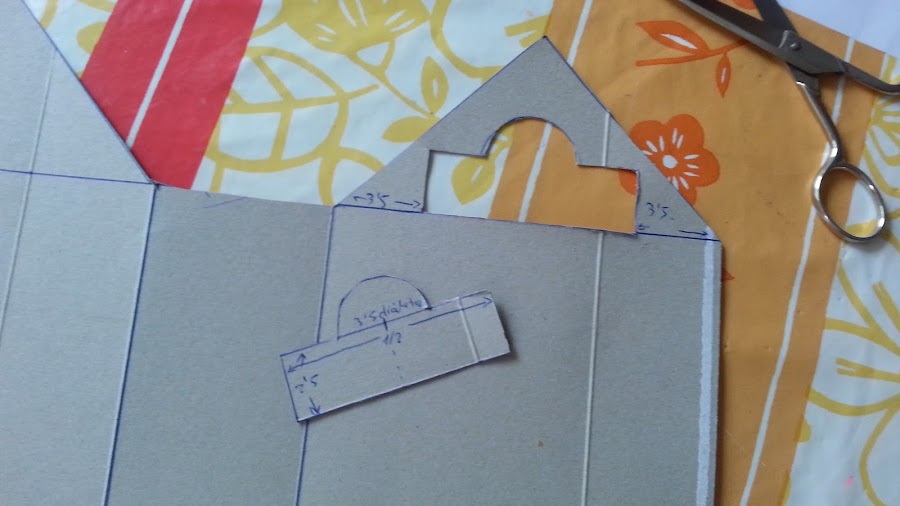 Procedemos a hacer el tejado,para ello cortamos 2 cartones de 14 cm x 9 cm y uno de 28 cm x 8,5 cm.Lo pegamos al fieltro dejando márgenes.Entre los 2 cartones dejamos 0,2milímetros para luego doblarlo.