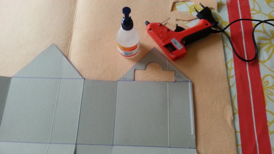 Ponemos la casita encima del fieltro o goma eva y procedemos a pegarlo con silicona.Dejamos margen.En la parte de abajo lo pegamos al borde.