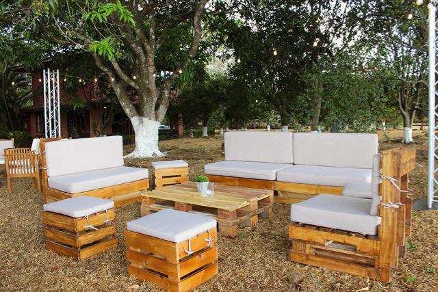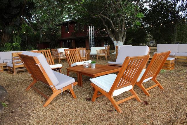 Escogimos el mobiliario del catálogo «playa y jardín» de D’Gala. Creamos tres ambientes distintos: primero tendríamos una sección de llegada con unas mesas cocteleras de ruedas de carreta y la mesa de regalos. Luego, en la terraza estarían unas mesas rectangulares grandes con bancas y sillas, ideales para sentar a los invitados más estructurados. Finalmente tendríamos un área en el jardín con salas «lounge» para un ambiente más relajado.