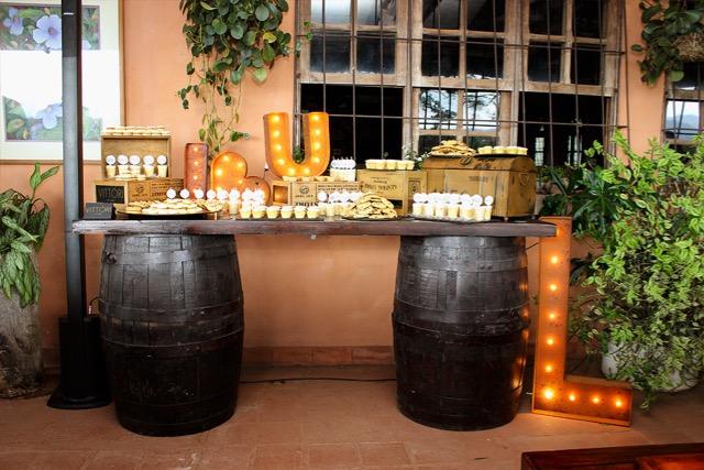 Como no dispusimos de un tiempo de comida formal, pensamos que como postre la mejor opción era una mesa de dulces variados. Esto permite dejarla lista previo a la llegada de los invitados sin tener que preocuparse de servirlos y además forma parte de la decoración.