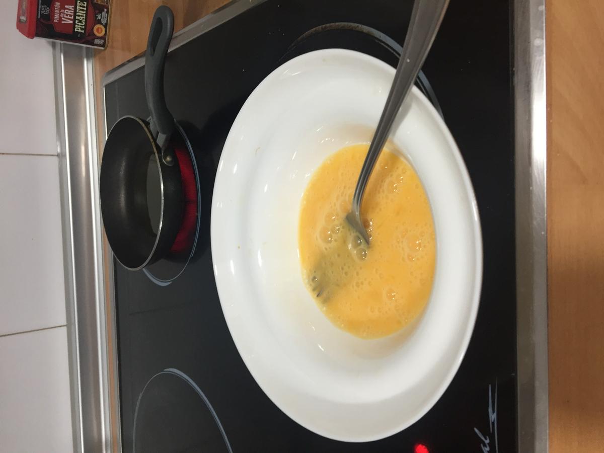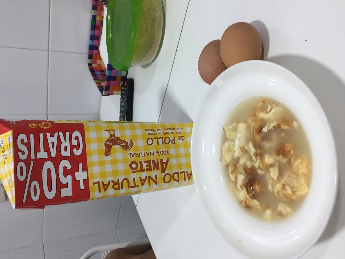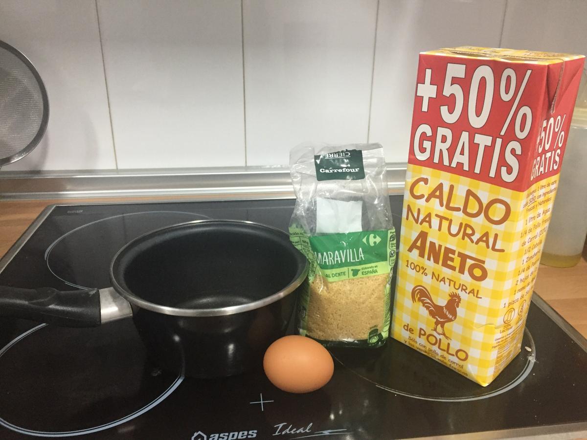 Echamos en un cazo medio brick de caldo de pollo y lo calentamos hasta que hierva. Mientras batimos el huevo y lo hacemos tortilla francesa.