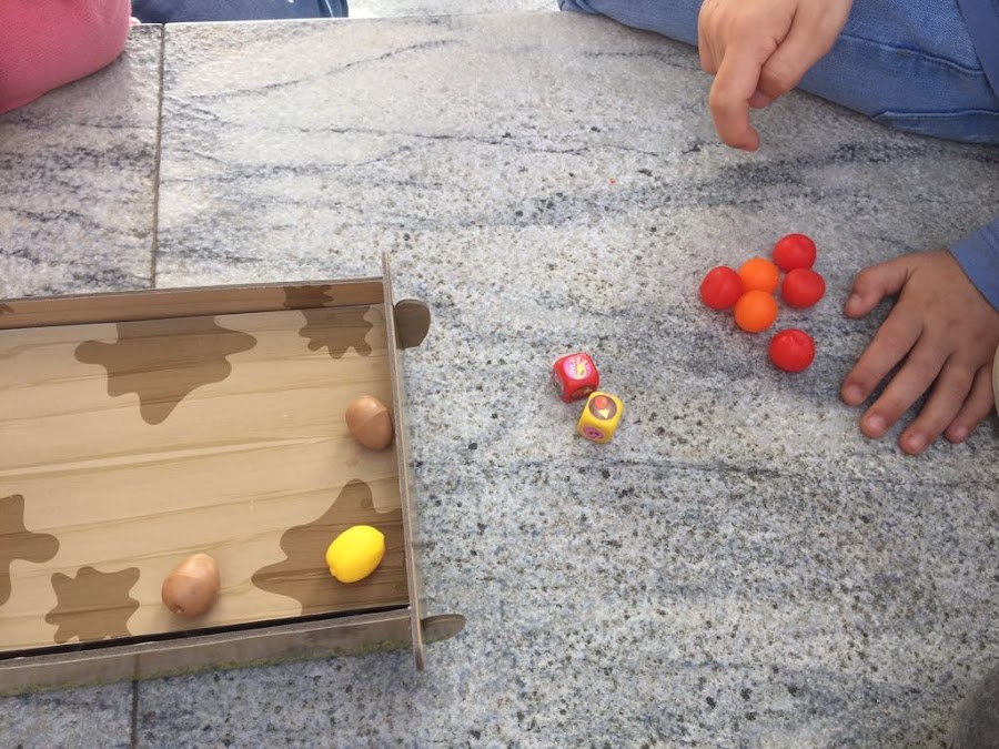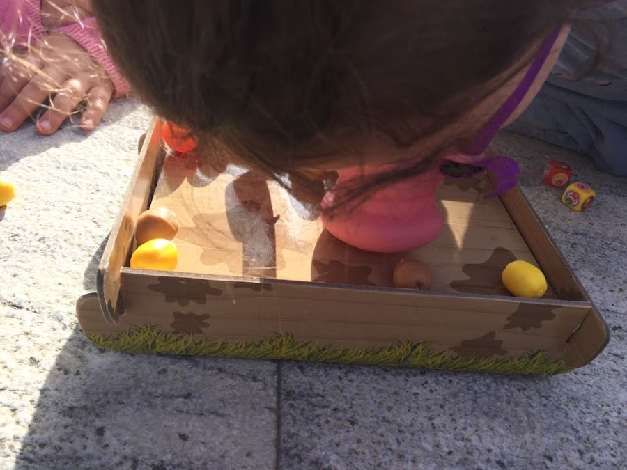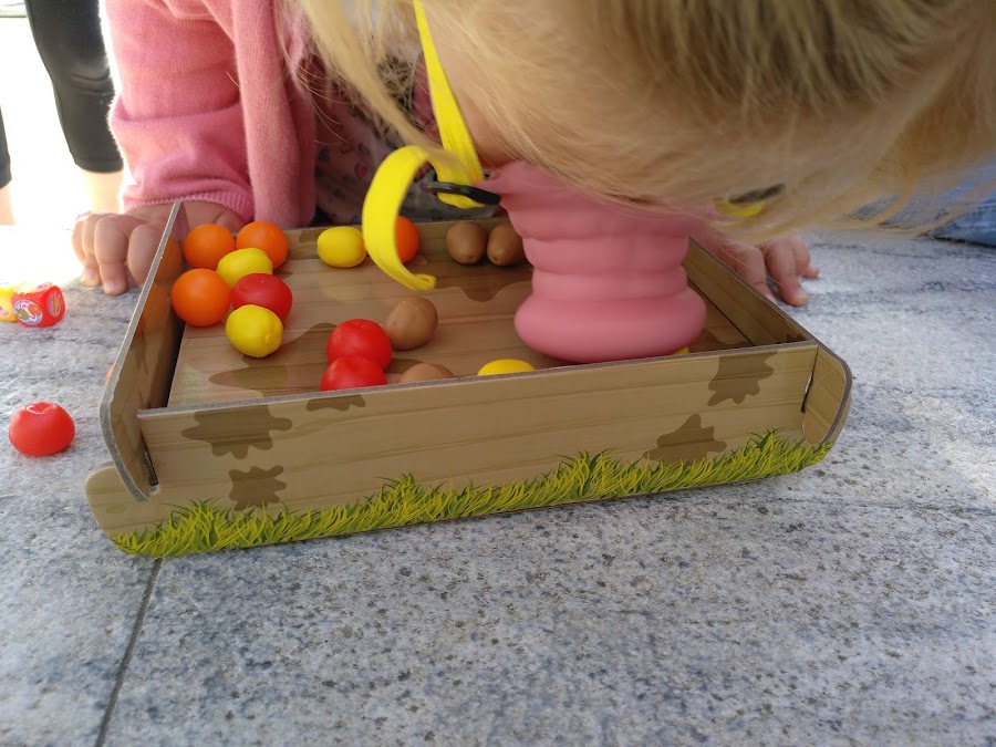 Los peques se lo han pasado genial, no han parado de reírse. Al principio les costó un poco, aunque parece fácil atrapar las frutas y verduras con el hocico pero no lo es. Hay que ejercer la presión justa e intentar poner el hocico lo más recto posible.