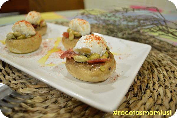 Con cuidado de no quemarnos y no romper los huevos al retirar el film colocaremos estos sobre los champiñones ya rellenos , espolvoreamos con un poco de pimenton dulce y listos para una explosión de sabor .