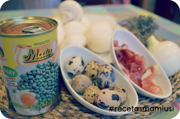 Durante esos diez minutos que estarán asándose los champiñones , doraremos en una sarten una cebolleta mediana y cuando este bien pochadita agregaremos las habitas Mata y el jamón ibérico hecho trocitos muy pequeños y daremos unas vueltas para templar y así poder rellenaremos los champiñones.