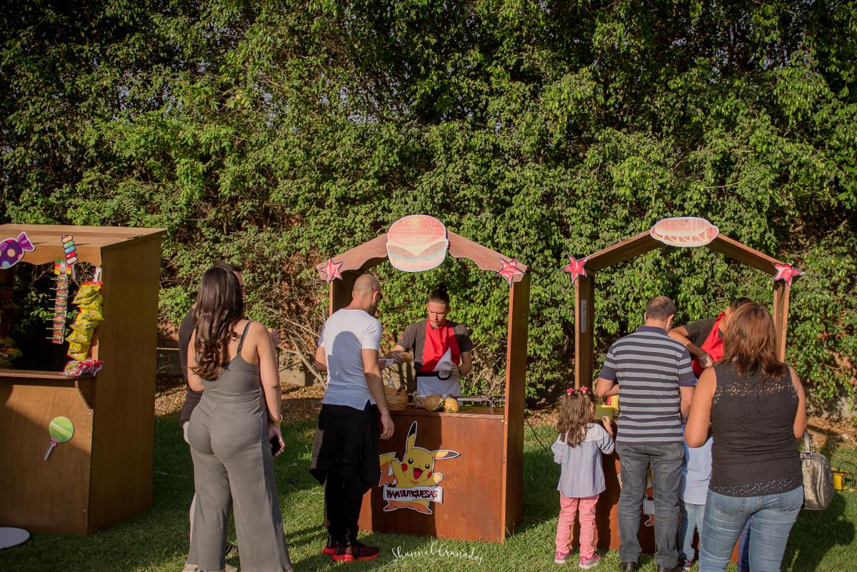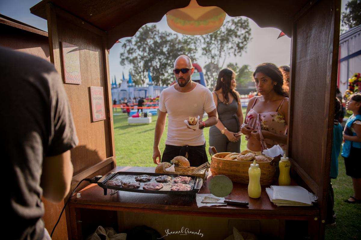 La mayoría de adultos se inclinan por lo salado, es por eso que decidí contratar el servicio de casitas snacks y elegí hamburguesas de carne (100 unidades), pan con hot dog ( 100 unidades) y panchos (50 unidades). Los chicos que atienden son muy amables y llevan mandiles personalizados. El servicio lo da @detallesdekodulce