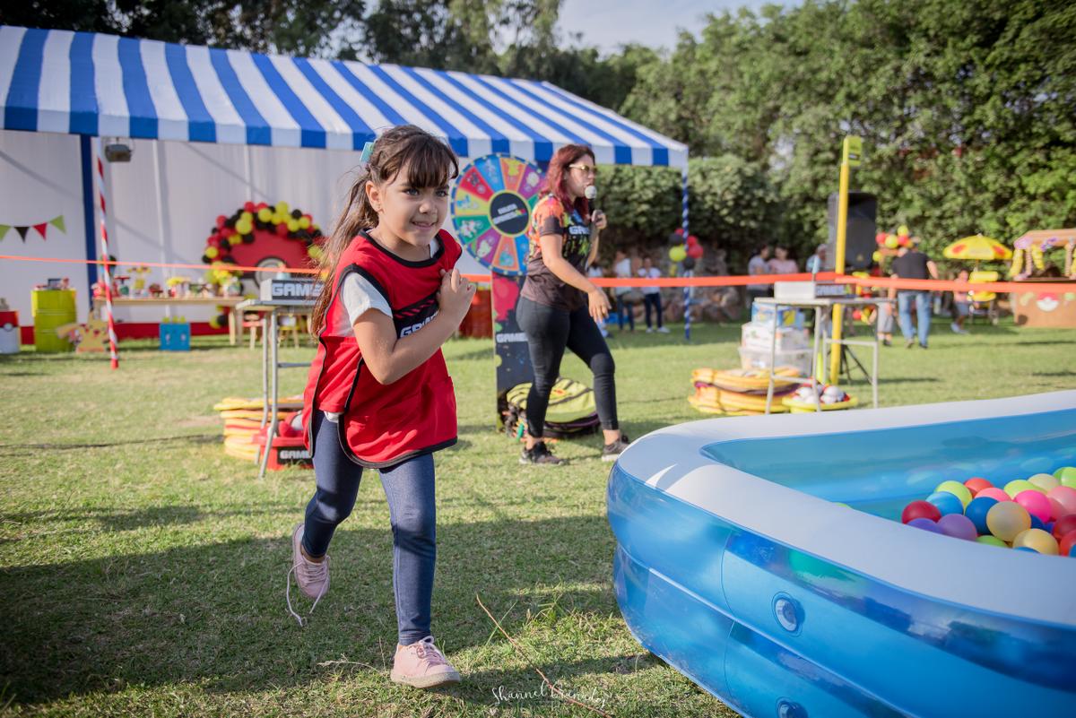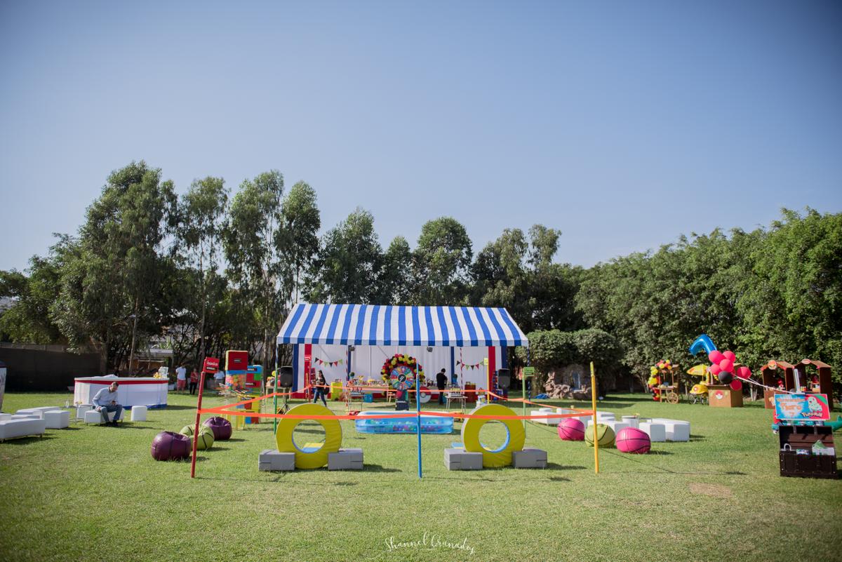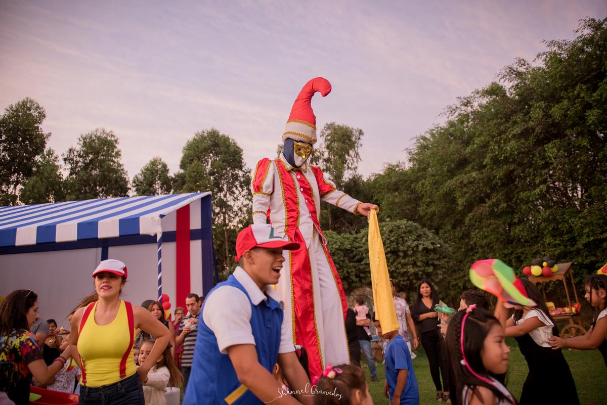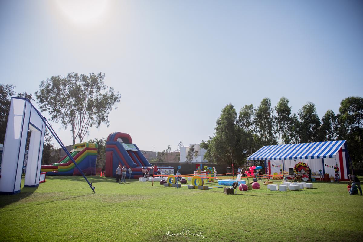 Toldo: Siempre he recomendado el servicio del señor Pedro de la empresa LOBRECY, ellos realizan unas estructuras hermosas y cada año me sorprenden con sus diseños. Como el espacio que había alquilado en la naval era bastante grande, el señor Pedro me recomendó colocar en la entrada una estructura cuadrada y un toldo en caída para la mesa de dulces de aprox 12 metros X 5 metros y los juegos de competencia al aire libre como un lindo parque de diversiones. Él también se encargó de la barra circular, la verdad fue un hit porque me permitió guardar mis sorpresas, dos coollers que había llevado y algunas cosas X.