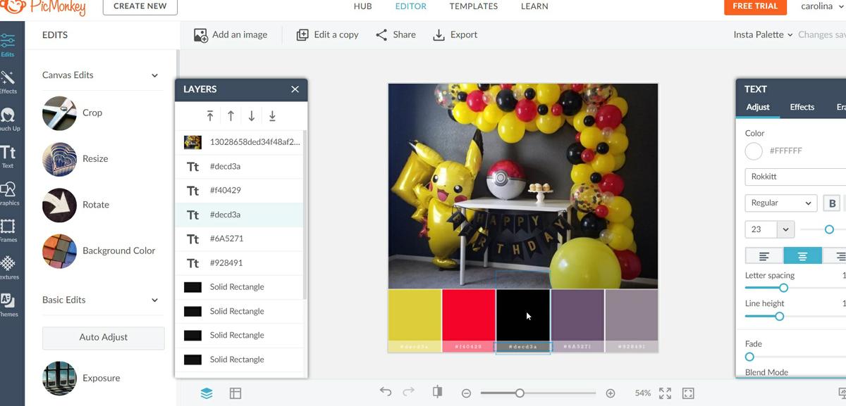 También puedes realizar el collage en illustrator y si quieres algo más práctico y con funciones muy buenas puedes trabajar en PicMonkey, es mi favorito porque te puede dar los códigos de color para que puedas enviar a todos tus proveedores como a la decoradora, dulces y toldo.