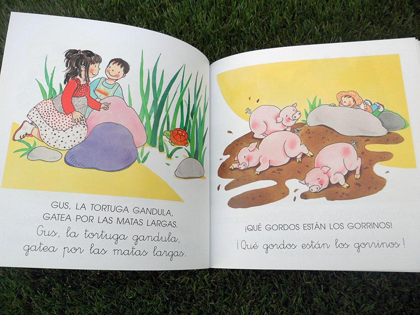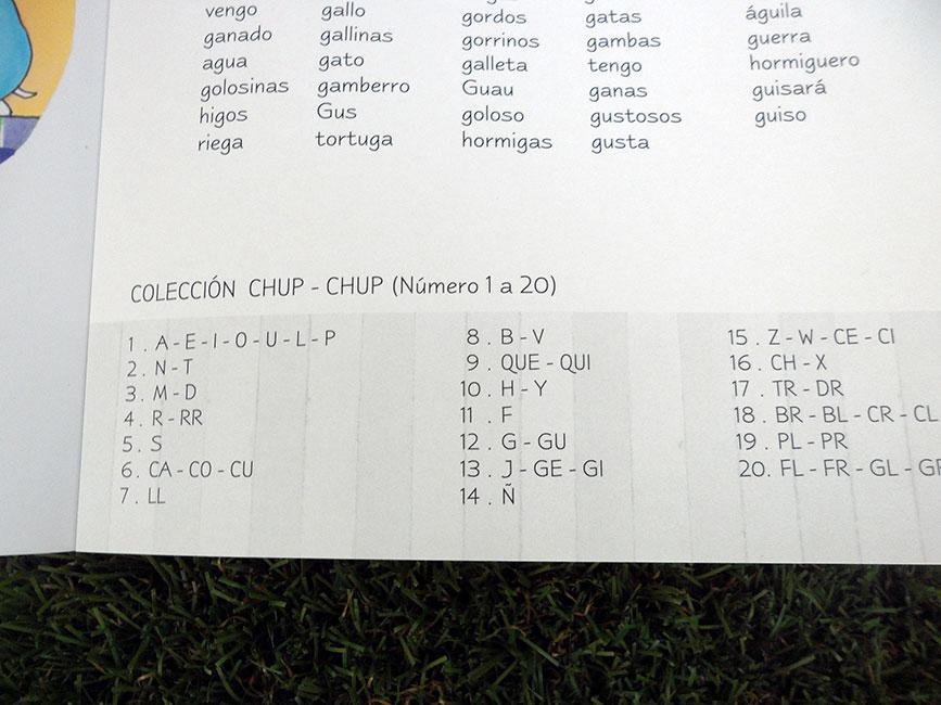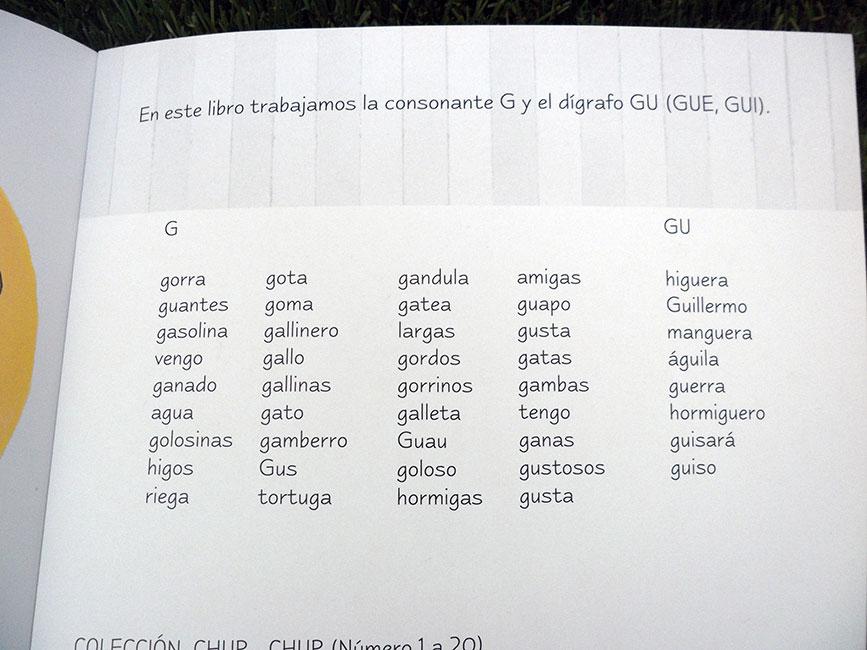 Chup-chup 12 habla de estos tres pequeños, Teresa, Pepe y Lola, que van al campo con sus padres a visitar a Guillermo. Con él comprueban como funciona el riego por goteo para las plantas, juegan y visitan a diferentes animales de la granja y buscan caracoles para que luego su mamá los guise. Como se pretende trabajar la lectura de la G y la GU, pues imaginaos, toooodas las frases llenas de palabras con G y GU. Muy divertido.