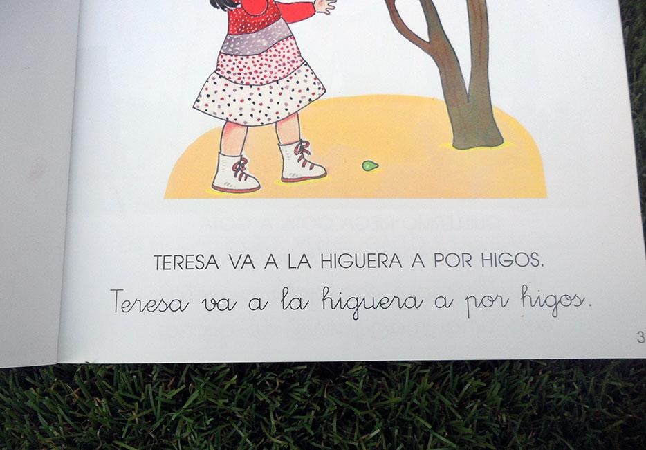 El texto está en dos formatos, en la parte superior en letra mayúscula y en la parte inferior en letra ligada. De esta manera, según el niño como haya empezado a trabajar con las letras, podrá reconocerlas mejor de una manera u otra. Y de la misma manera, podrá ir empezando a reconocer otras formas de escritura, que también es muy interesante.