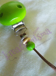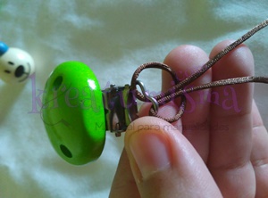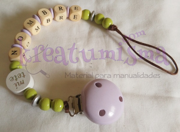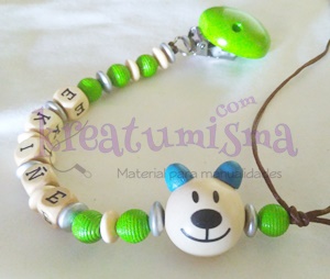Ocultaremos el doble nudo con las cuentas que vayamos pasando para la cadena. En este chupetero alternamos lentejas con bolas estriadas (las puedes encontrar en nuestra tienda online en la sección especial de chupeteros y collares de lactancia)